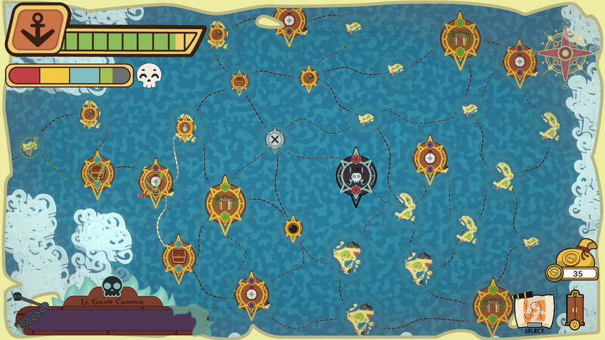 Every travel is a chain of several minigames that climb in difficulty every time you win. Losing mini-games will damage your ship meanwhile winning keep the morale of your crew up. Having a good moral level makes rewards you earn when you reach a new island better.